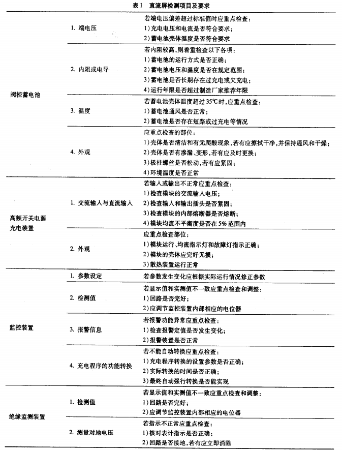 在建立完善的點檢制度之前,首要必須制定契合現場要求,并可以作為依據的設備檢修標準。在直流屏標準中規則了直流電源體系設備檢修的基本要求,檢修前的準備、檢測項目、充放電試驗等內容。直流屏主要由蓄電池.高頻開關電源充電設備,監控設備、絕緣監測設備4部分組成,見表1。