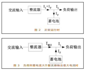 (2)當負荷呈大電流時,整流器自身已不能滿意負荷要求,即超越整流器所能輸出的最大電流IMsx,這時,將由整流器和蓄電池同時供電,蓄電池輸出電流為IF,向負荷供給的電流輸出為ILIL=IF+IMAX,如圖3所示。