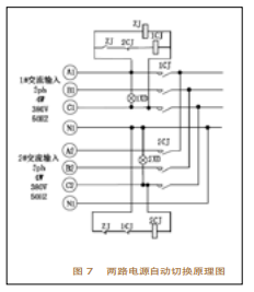 在直流屏中,除了整流器和蓄電池外,還有一個重要的部分,即交流輸入電源部分。交流輸入電源是直流屏能否正常供電的前提條件,而一般直流屏所需要的交流輸入電源,都是由兩路電源組成,一路主用,另一路備用。在主用電源停電時,備用電源自動切換,在主用恢復供電時,自動切換回主用。下面介紹一下兩路電源自動切換的原理,自動切換原理圖如圖7所示。三相交流輸入AlB1Cl1#輸入電源,三相交流輸入A2B2C22#輸入電源。正常情況下,即1#2#交流輸入電源供電正常時,在1#交流輸入電源控制回路中,中心繼電器ZJ線圈帶電,使其常開觸點ZJ閉合,一起2#交流輸入電源回路中的Z常閉觸點斷開,2#交流輸入電源控制回路中的2#接觸器2CJ線圈不帶電,那么,1#交流輸入電源控制回路中的2CJ常閉觸點是閉合的。因而,1#交流輸人電源控制回路中ZJ-2CJ-ICJ回路通電,1#接觸器1CJ的主觸點閉合,l#交流輸人電源主回路接通,1#交流輸入電源被接入整流器回路中,供應整流器交流電源。當1#交流輸入電源遽然間斷時,中心繼電器Z線圈失電,其常開觸點Z翻開,使ZJ-2CJ-ICJ回路斷電,接觸器ICJ主觸點斷開,主回路斷開。而此刻在2交流輸入電源控制回路中,由于中心繼電器Z線圈的失電,使Z常閉觸點閉合,加之1#接觸器lCJ線圈的失電,使ICJ的常閉觸點也閉合。因而,2交流輸入電源控制回路中ZJ-ICJ-2CJ回路通電,2m接觸器2CJ線圈帶電,使2#接觸器2CJ主觸點閉合,2#交流輸入電源主回路接通,2m交流輸入電源被接入整流器回路中,供應整流器交流電源。當l#交流輸入電源恢復供電時,2#交流輸人電源回路中的常閉觸點ZJ翻開,2”接觸器線圈2CJ失電,2接觸器主觸點斷開,切斷了2#交流輸入電源供電,1#交流輸入電源又被從頭切換回整流器供電回路中去。