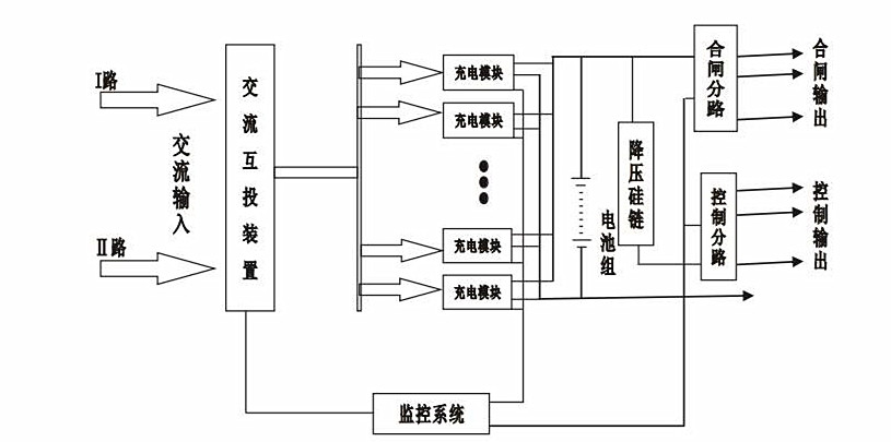常規(guī)直流屏首要由溝通配電模塊、充電模塊、配電監(jiān)控模塊、降壓硅鏈等零件構(gòu)成。如圖1為典型的直流屏結(jié)構(gòu)體系。
