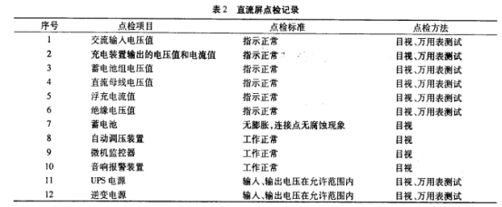 首要需求編制點檢標準,編制出符合實際出產需求的點檢標準,使其他點檢者能快速、簡潔履行點檢標準。點檢標準的內容觸及方面比較多,列入點檢處理規模的部位也比較多,例如直流屏,交流輸入電壓值、充電設備輸出的電壓值和電流值、蓄電池組電壓值、直流母線電壓值、浮充電流值、絕緣電壓值、蓄電池、主動調壓設備、微機監控器、音響報警設備、UPS電源、逆變電源等都是關系到直流屏安全作業的重要參數及設備,確認為點檢部位。點檢部位確認后,就要履行點檢內容,點檢辦法現在還是以簡單東西、儀器和人的感觀為主的點檢辦法。因而,點檢內容首要是檢查設備溫度、電壓、表計指示、作業情況等方面參數。直流屏設備點檢作業首要是以日常點檢為主,守時點檢為輔。日常點檢首要以人的感官為主,通過聽、摸、看.擰等辦法對作業中的設備進行一個外觀的檢查。通過每日進行的點檢作業,及時發現設備存在的風險并消除,使設備長周期安全作業。由于直流屏的特殊性,展開的直流屏設備專業點檢也很重要,點檢辦法以工用具、表面和人的感觀為主的點檢辦法。通過守時進行的點檢作業,及時發現設備存在的風險并消除,使設備長周期安全作業,見表2